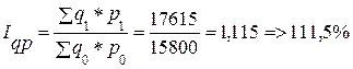 Определить общий индекс цен (по формуле 1.4) в агрегатной форме по приведенным данным нельзя, т.к. неизвестна цена -