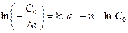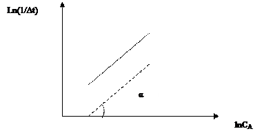 В результате получили линейную зависимость ln(1/∆t) от lnC0A. В этом случае порядок реакции можно определить по углу наклона получившейся прямой: