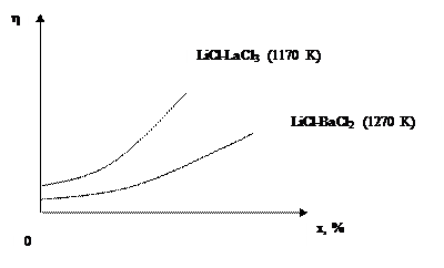Понятие вязкости позволяет сделать заключение о наличии в расплавленных солях, кроме элементарных частиц, сложных группировок, вероятность образования которых напрямую зависит от силы взаимодействия катионов и анионов. Добавление к хлоридам щелочных металлов хлоридов поливалентных металлов ведет к значительному увеличению вязкости солевых смесей. Наблюдаемые отрицательные отклонения значений вязкости от расчетных значений больше, чем у смесей хлоридов щелочных металлов.