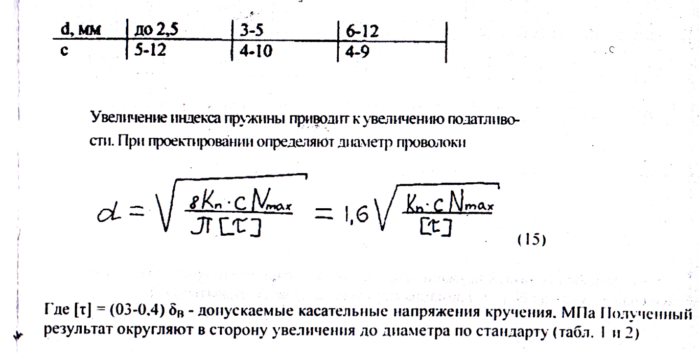 Затем задаемся индексом пружины с= 10 и определяем коэффициент К. учитывающий кривизну вит ков, и диаметр проволоки. Определяем диаметр проволоки: