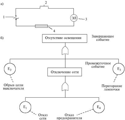 Рис.12. Электрическая схема системы "сеть - электрическая лампочка" (а) и дерево (б) для случая первичных отказов: 1 - сеть; 2 - выключатель; 3 - электролампа; 4 - предохранитель