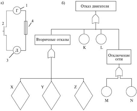 Рис.13. Электрическая схема системы "генератор -двигатель" (а) и дерево (б) для случая вторичных отказов: 1 - генератор; 2 - выключатель; 3 - электродвигатель; 4 - предохранитель