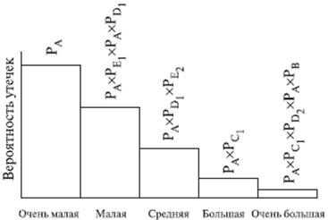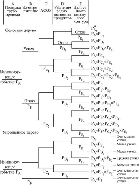 Допустим, путем выполнения ПАО было выявлено, что критической частью реактора, т.е. подсистемой, с которой начинается риск, является система охлаждения реактора; таким образом, анализ начинается с просмотра последовательности возможных событий с момента разрушения трубопровода холодильной установки, называемого инициирующим событием, вероятность которого равна PA (рис.15), т.е. авария начинается с разрушения (поломки) трубопровода - событие A. Далее анализируются возможные варианты развития событий (B, C, D и E), которые могут последовать за разрушением трубопровода. На рис.15 изображено дерево исходных событий, отображающее все возможные альтернативы. На первой ветви рассматривается состояние электрического питания. Если питание есть, следующей подвергается анализу аварийная система охлаждения активной зоны реактора (АСОР). Отказ АСОР приводит к расплавлению топлива и к различным, в зависимости от целостности конструкции, утечкам радиоактивных продуктов.