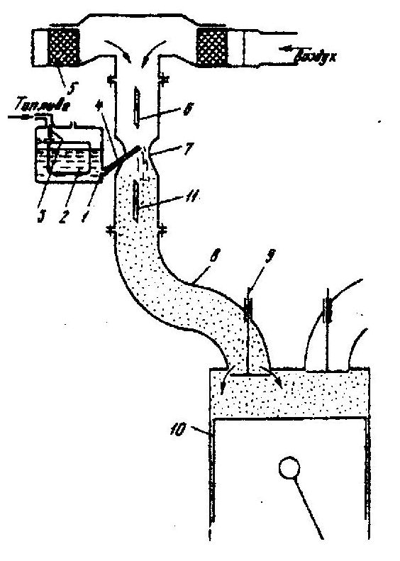 | 1 – главный жиклер; 2 – поплавок; 3 – игольчатый клапан; 4 – распылитель; 5 – воздухоочиститель; 6 – воздушная заслонка; 7 – диффузор; 8 – впускной трубопровод; 9 – впускной клапан; 10 – поршень; 11 – дроссельная заслонка Рисунок 11 – Схема простейшего карбюратора |