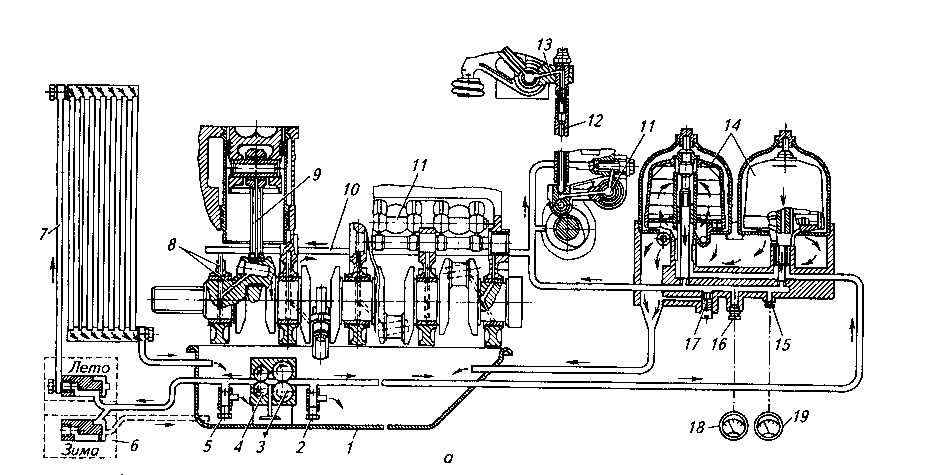 температуры и давления масла; 17 – сливной клапан; 18, 19 – указатели