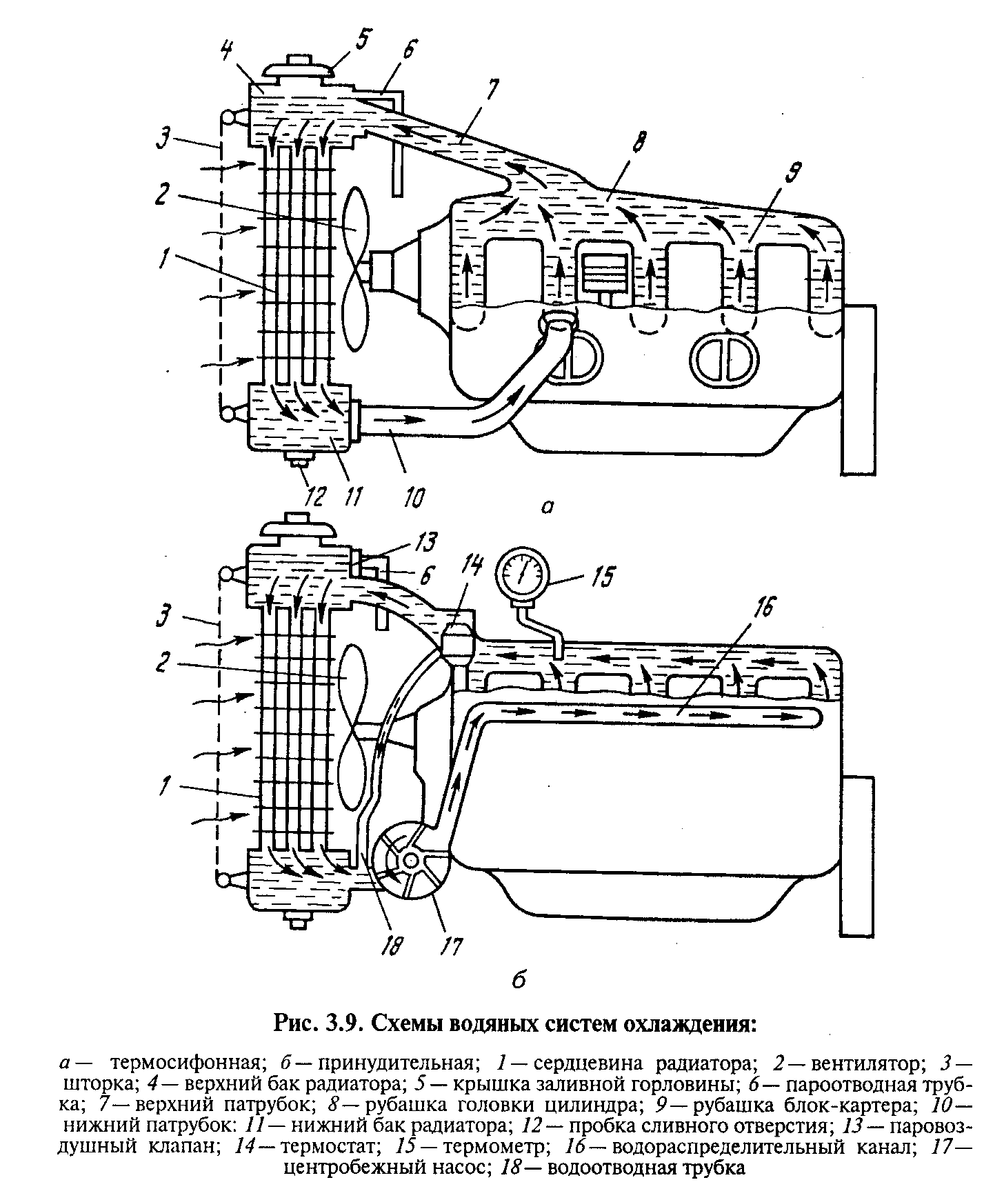 В зависимости от вида рабочего тела, осуществляющего теплоотвод от головок и цилиндров, системы охлаждения автотракторных двигателей делят на два вида: