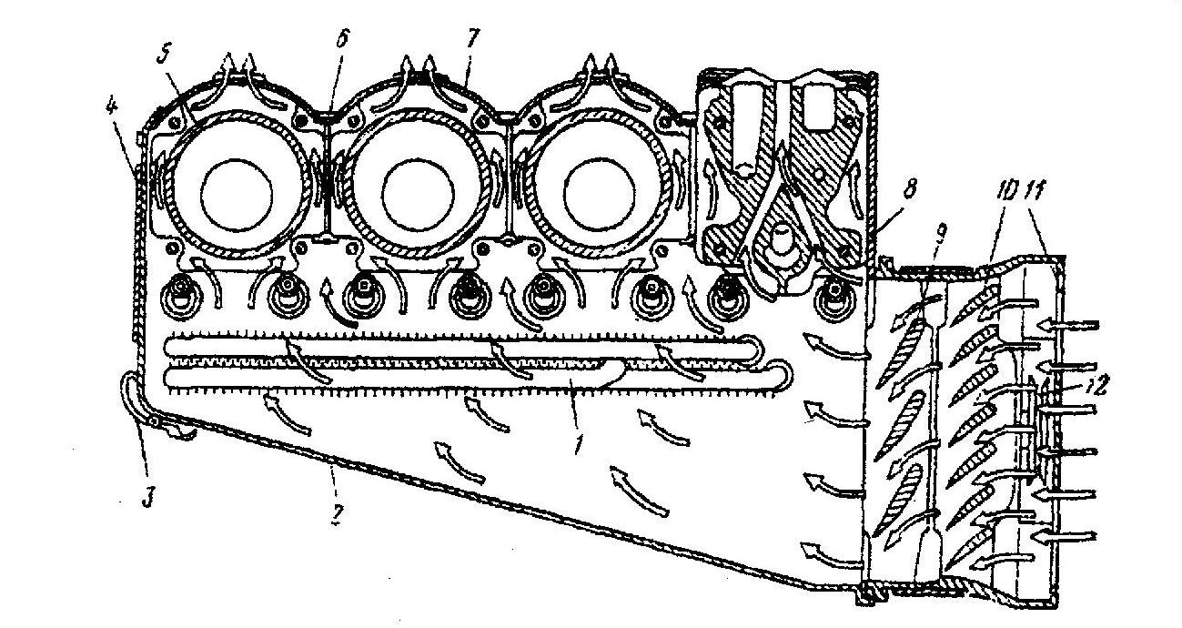 Воздух, нагнетаемый вентилятором, направляется кожухом в межреберное пространство цилиндров и головок. Дефлекторы распределяют поток воздуха по поверхности цилиндров и головок, что способствует равномерному охлаждению деталей двигателя.