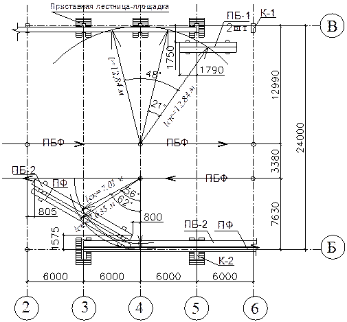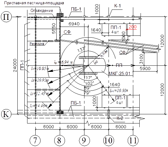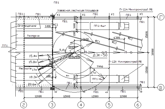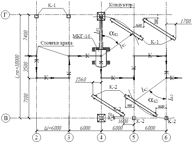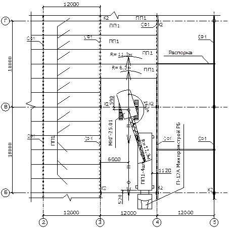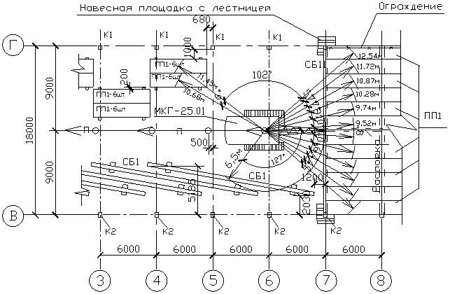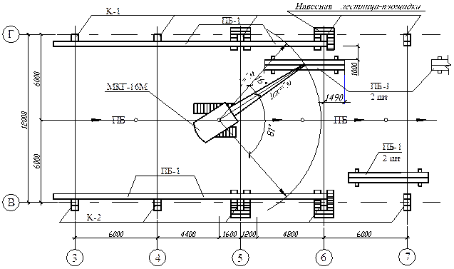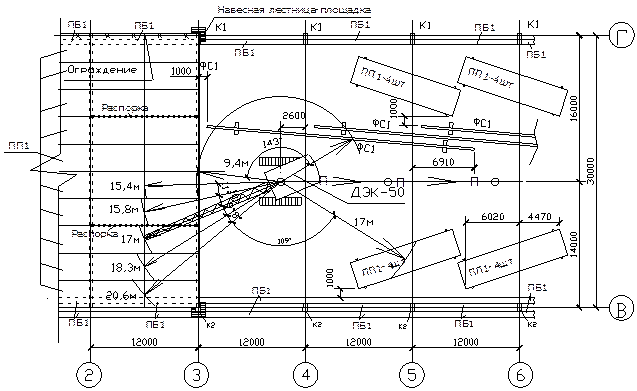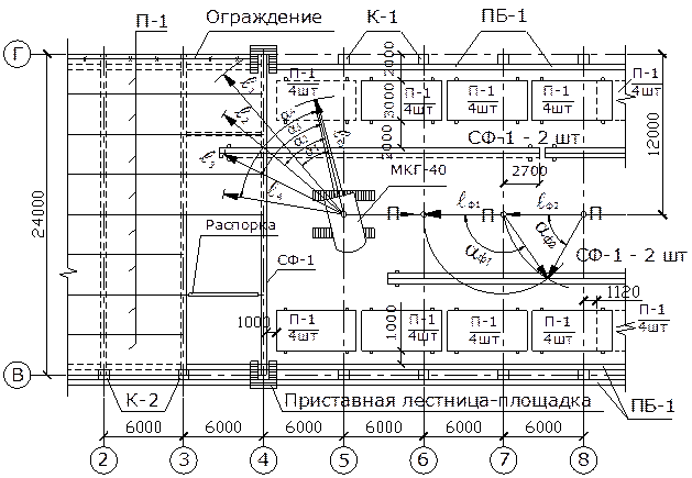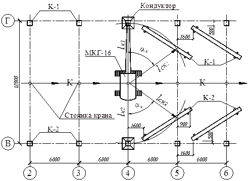 При пролете 24 и 30 м (рис.4.4.21…4.4.23) плиты покрытия располагаются вдоль пролета в двух штабелях по обе стороны относительно крана.
