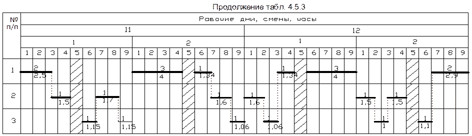 При построении часового графика нужно стремиться к обеспечению монтажа целого количества элементов до обеда и после обеда. В отдельных случаях обеденный перерыв, из условия обеспечения монтажа целого количества элементов, в незначительных пределах можно переносить (см. табл. 4.5.2).
