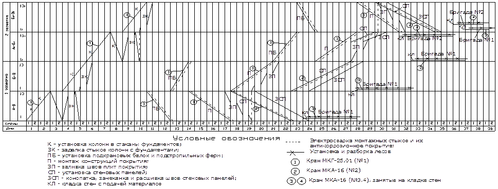 3. Часовой график построен в соответствии со схемой движения крана и порядком монтажа элементов, представленных на рис. 4.5.1.