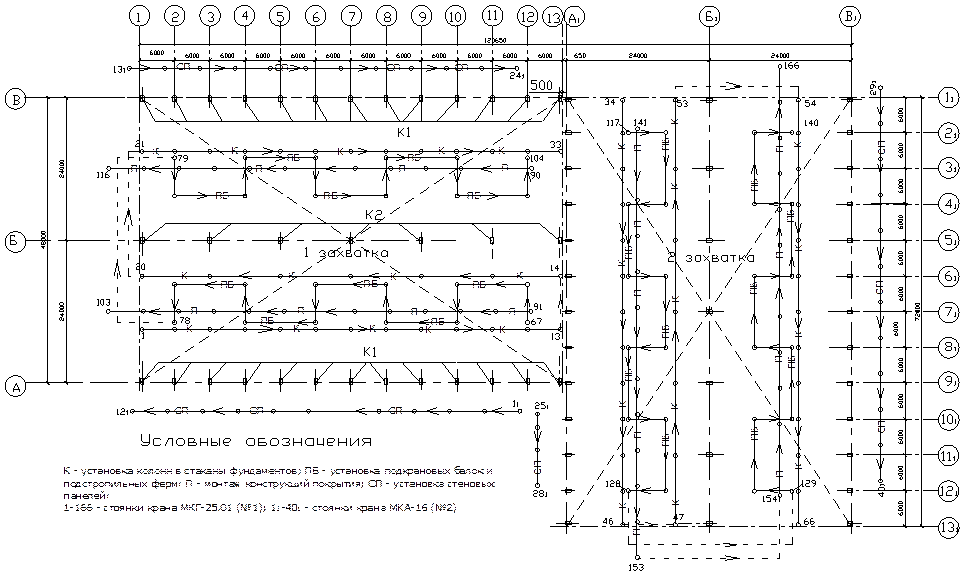 Часовой график составляется только на основные (монтажные) процессы на основании предварительно разработанной схемы движения крана на захватке с указанием порядка монтажа элементов (рис. 4.5.1).