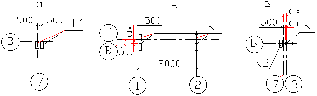 Рисунок П1.2 - Узлы примыкания температурно-деформационных блоков одноэтажного каркасно-панельного здания с указанием вставок между осями: а - при устройстве поперечного температурного шва между блоками без вставки; б – в продольном температурном шве при одинаковой высоте смежных блоков; в – в случае примыкания поперечного пролета к продольным