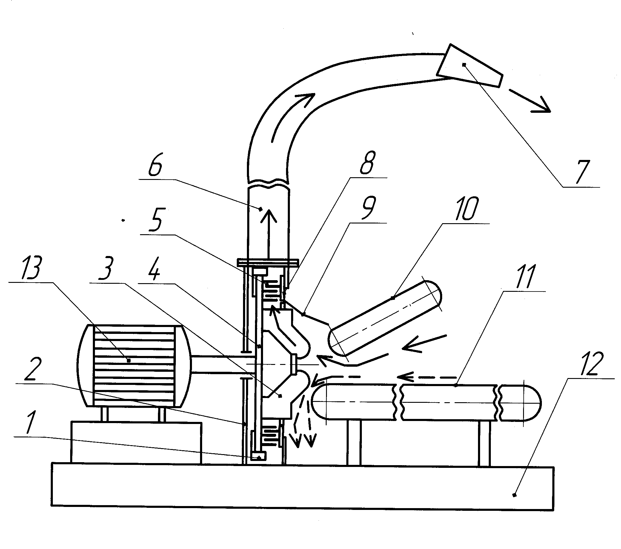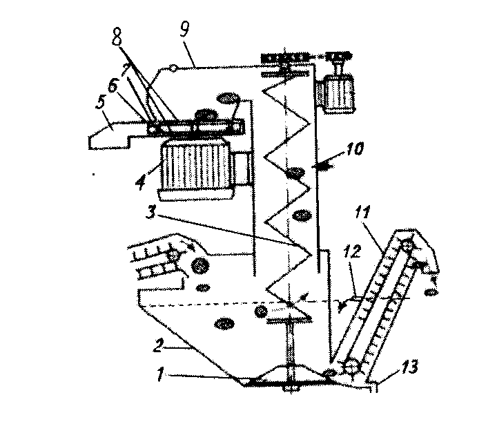 11 – нижний подающий транспортер; 12 – рама; 13 – электродвигатель