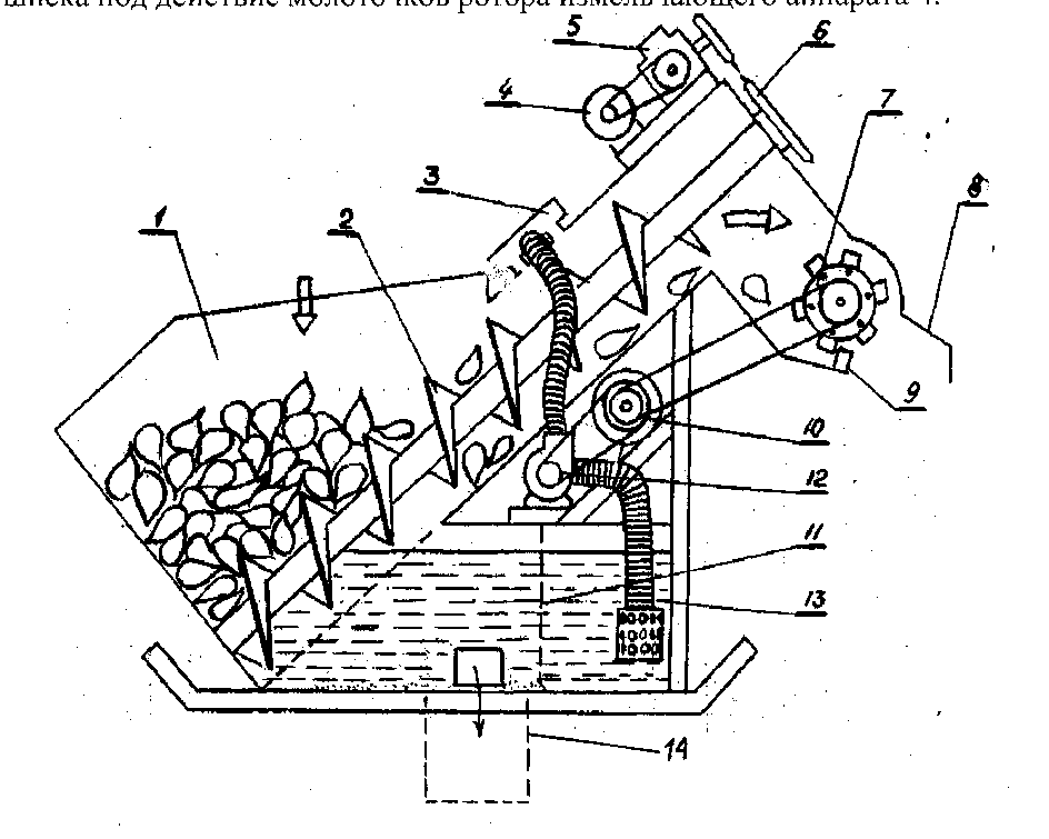 9 – корпус измельчителя; 10 – патрубок подачи воды; 11 – транспортер-камнеудалитель; 12 – патрубок уровня воды; 13 – сливной патрубок