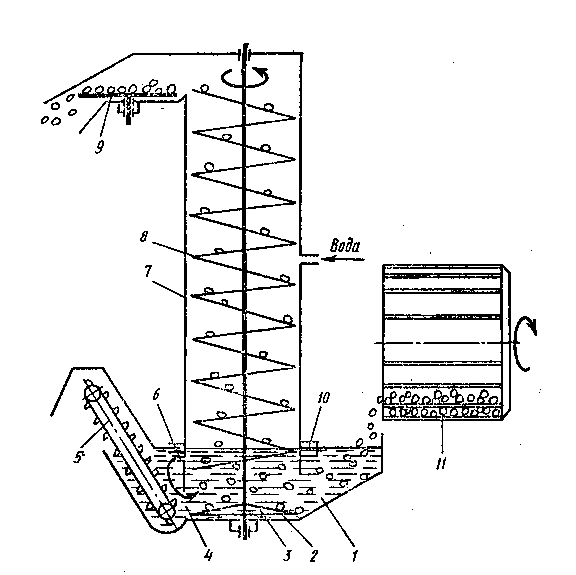 1 – бункер; 2 – моющий шнек; 3 – патрубок; 4,10 – электродвигатели;
