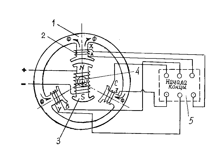 На сердечнике статора 1 расположены три обмотки (фазы статора 2). Они сдвинуты по отношению одна к другой на 120о. Начало и концы фаз статорной обмотки выведены наружу к зажимам на корпусе машины 5. На роторе 3 располагается обмотка возбуждения 4, питаемая постоянным током от аккумуляторов или небольшого по мощности дополнительного генератора (на рис. не показаны).