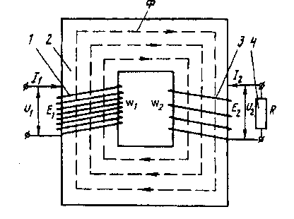 1 – первичная обмотка; 2 – сердечник; 3 – вторичная обмотка; 4 – нагрузка