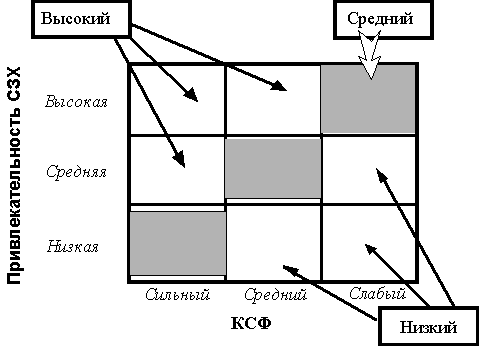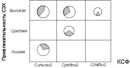 Пионером в разработке усовершенствованной матрицы стратегического портфеля СЗХ фирмы с переменными привлекательность СЗХ- КСФ является фирма «Дженерал электрик» (в сотрудничестве с консультативной фирмой Mc Kinsey). Эта матрица имеет размерность 3x3. В ней площади кругов, отображающие СЗХ, пропорциональны объемам продаж в них, а заштрихованные секторы показывают долю рынка, контролируемую фирмой (рис. 52).