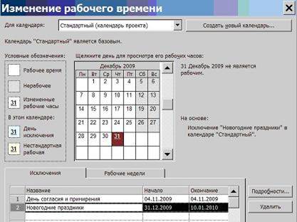· аналогично добавить исключение Новогодние праздники, начинающееся 31.12.09 и заканчивающееся 10.01.10; итоговый вид окна после всех преобразований изображен на рисунке 1.
