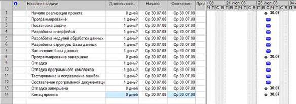 · в столбце Длительность установить для вех длительность в 0 дней, результат – на диаграмме Ганта эти задачи изображены ромбиками; результат ввода задач проекта изображен на рисунке 2.