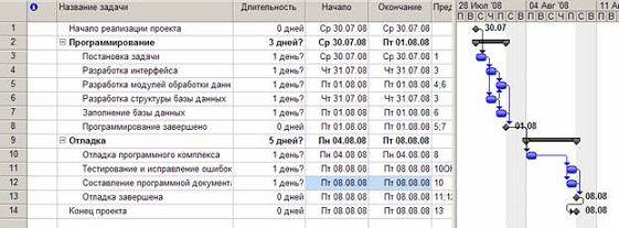 · нажать кнопку (на уровень ниже) на панели инструментов Форматирование; результат – выделенные задачи становятся подзадачами, входящими в Программирование, а само Программирование – фазой, т.е. составной задачей; на диаграмме Ганта фаза изображается отрезком в виде горизонтальной скобки;