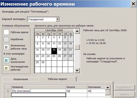· нажать кнопку Изменить рабочее время – откроется индивидуальный календарь ресурса (рисунок 10);