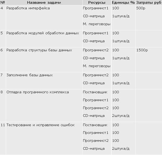 · в таблицу ресурсов добавить записи: Постановщик – 100, Бумага –1, CD-матрица – 1штука/н, Междугородные переговоры – 1000 р.