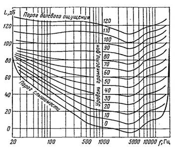 Орган слуха человека реагирует не на абсолютное нарастание силы и частоты звука, а на их относительное увеличение. Поэтому более важно знать отношение интенсивностей двух звуков, а не их абсолютные значения. Диапазон интенсивностей звуков, воспринимаемых органом слуха, очень широк. Установлено, что звуковые ощущения пропорциональны логарифму раздражения (закон Вебера-Фехнера). Пороговое значение силы звука L, завися-щее от частоты f, показано на рис. 6.1.