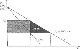 В стандартном курсе микроэкономики при описании ущерба от монополии ограничиваются указанием на безвозвратные потери (на графике представлены закрашенным треугольником DWL}, а монопольная прибыль я (на графике представлена площадью заштрихованного прямоугольника) рассматривается как результат перераспределения излишка потребителя в пользу монополиста и ее величина не считается частью потерь общего благосостояния. Прим: с –средние издержки.