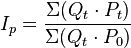 Индекс Ласпейресаопределяется путём взвешивания цен двух временны́х периодов по объёмам потребления базисного периода и отражает изменение стоимостипотребительской корзины
