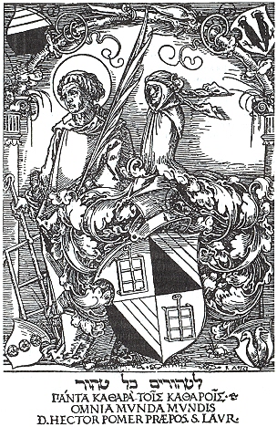 Владельцы печатных книг уже через два десятилетия после начала типографской эры также обзаводятся гравированными эмблемами — экслибрисами. Чаще всего они создаются на основе геральдических композиций. «Старейший датированный книжный знак принадлежал Гансу Разу из Кестера: на нем сохранилась рукописная помета "1491". На экслибрисе базельского епископа Теламения Ламбергера, выполненном в 1498 году, впервые отпечатана дата. На знаке изображен не только герб, но и сам владелец — на коленях перед своим святым патроном. Это, таким образом, и первый известный нам портретный экслибрис» 24.