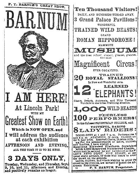 Действительно, изобретательность и неординарность рекламных акций Ф. Барнума превосходила все известное до него. Как это часто случается, путь к изобретениям лежит на скрещении различных профессиональных умений. Барнум начинал с должности продавца медицинских патентованных средств, в освоении которой выяснил продуктивность применения рекламных трюков. Далее судьба занесла его в шоу-бизнес на должность директора цирка. Затем — скрещение двух обретенных профессиональных навыков: организация цирковых дивертисментов со специальной целью рекламирования тех фирм, которые не поскупятся на оплату недешевого зрелища. Желающие нашлись, и в 1849 году на улицах Нью-Йорка появились вагончики, обклеенные рекламными текстами и запряженные цирковыми слонами. Фурор был необычаен — вряд ли хоть один горожанин не выбежал смотреть эту экстравагантную процессию. Не обратить внимания на предлагаемую слонами рекламу было выше человеческих сил: ее читали, обсуждали, осуждали, осмеивали... Рекламодатели Барнума на эффективность затраченных средств пожаловаться не могли.