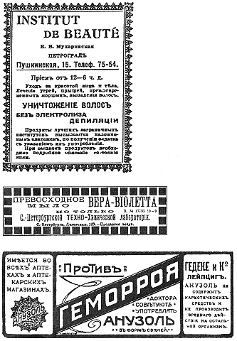 Как и в нынешнее время, наибольший объем лживой и некорректной рекламы выпадает на долю лекарственных и косметических средств. В том, что касается здоровья и внешности, публика проявляет наибольшую некритичность и доверчивость. Жидкости для волос, способные обратить лысые головы в буйные кудри, пилюли, способные придать классические формы впалой и гипертрофированной груди, порошки, благодаря которым толстый человек может приобрести изящную естественную фигуру.