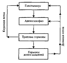 Рис. 12. Регуляция нейросекреции по механизму обратной связи. Петли обратной связи обусловливают торможение экскреции гормонов аденогипофиза и гипоталамуса гормонами желез-мишеней и тройными гормонами аденогипофиза