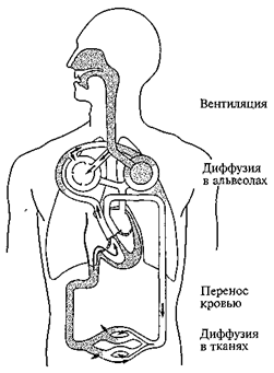 Рис. 19. Транспорт кислорода у человека (направление показано стрелками)