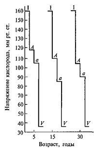 Рис. 20. Каскад напряжений кислорода во вдыхаемом воздухе (I), в альвеолах (А), артериях (а) и венах (К) У мальчика 5 лет, подростка 15 лет и взрослого 30 лет