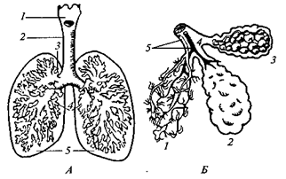 А: ] — гортань; 2 — трахея; 3 — бронхи; 4 — бронхиолы; 5 — легкие;