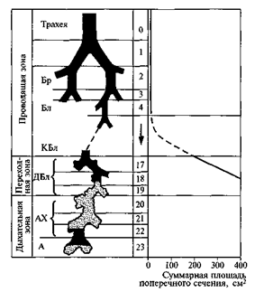 Рис. 22. Схема ветвления воздухоносных путей (слева). В правой части рисунка приведена кривая суммарной площади поперечного сечения воздухоносных путей на уровне каждого ветвления (3). В начале переходной зоны эта площадь начинает существенно возрастать, что продолжается и в дыхательной зоне. Бр — бронхи; Бл — бронхиолы; КБл — конечные бронхиолы; ДБл — дыхательные бронхиолы; АХ — альвеолярные ходы; А — альвеолы