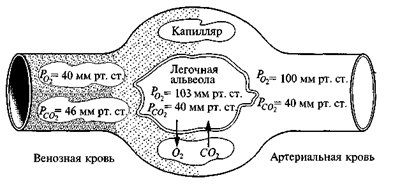 Рис. 23. Обмен газов в легочных альвеолах: через стенку легочной альвеолы О2 вдыхаемого воздуха поступает в кровь, а СО2 венозной крови — в альвеолу; газообмен обеспечивается разностью парциальных давлений (Р) СО2 и О2 в венозной крови и в полости легочных альвеол