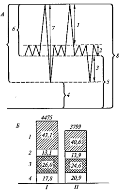 А — схема спирограммы: 1 — резервный объем вдоха; 2 — дыхательный объем; 3 — резервный объем выдоха; 4 —- остаточный объем; 5 — функциональная остаточная емкость; 6 — емкость вдоха; 7 — жизненная емкость; 8 — общая емкость легких; Б — объемы и емкости легких: /— юные спортсмены; // — нетренированные школьники (средний возраст 13 лет) (по А. И.Осипову, 1964). Цифры над столбиками — средние величины общей емкости. Цифры в столбиках — средние величины легочных объемов в процентах от общей емкости; цифры слева от столбиков соответствуют обозначениям на спирограмме