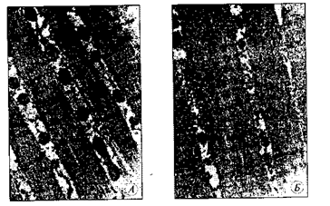 Рис. 35. Ультраструктура мышечной ткани человека: А — мальчик 11 лет; Б — взрослый мужчина