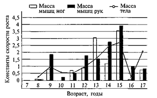 Рис. 37. Скорость роста массы тела и мышц конечностей у мальчиков
