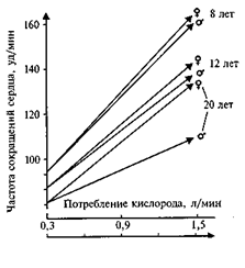 Рис. 39. Возрастные и половые различия зависимости частоты пульса от уровня нагрузки