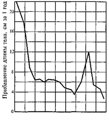 Понятие о «скачке роста». В тех случаях, когда во множестве различных тканей организма одновременно наблюдаются ростовые процессы, отмечаются феномены так называемых «скачков роста». В первую очередь это проявляется в резком увеличении продольных размеров тела за счет увеличения длины туловища и конечностей. В постнатальном онтогенезе человека такие «скачки» наиболее ярко выражены в первый год жизни (1,5-кратное увеличение длины и 3—4-кратное увеличение массы тела за год, рост преимущественно за счет удлинения туловища), в возрасте 5—6 лет (так называемый «полуростовый скачок», в результате которого ребенок достигает примерно 70 % длины тела взрослого, рост преимущественно за счет удлинения конечностей), а также в 13—15 лет (пубертатный скачок роста как за счет удлинения туловища, так и за счет удлинения конечностей).