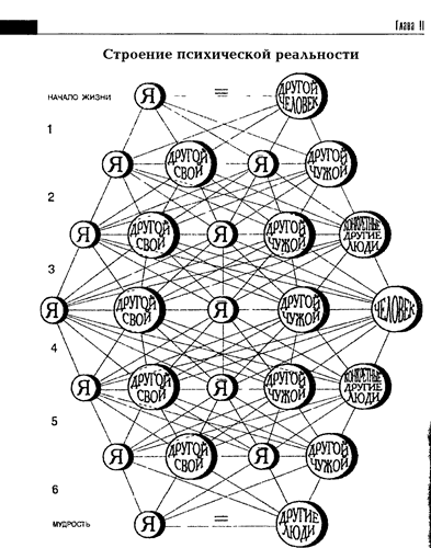 В весьма упрощенной схеме (см. схему «Строение психической реальности») психическую реальность можно представить следующим образом: каждый последующий период жизни человека (поэтому так важно решение проблемы периодизаций и психического развития) отличается от предыдущего тем, что появляются качественно новые отношения человека с собой и с другими людьми. В нашей схеме они в обобщенном виде представлены как усложнение связей «Я» и «Другого».
