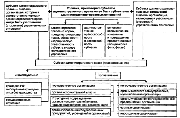 В правовых нормах субъектом административного права называется лицо или организация, которые при определенных условиях могут быть участниками (сторонами) управленческих отношений. Они определеляются общим (родовым) образом – как индивидуальные субъекты (граждане, государственные служащие) или как коллективные (органы исполнительной власти, органы управления государственных и негосударственных организаций и т.д.). В течение длительного времени они могут не вступать ни с кем в административные правоотношения, т. е. не становиться их участниками (субъектами или объектами управления).
