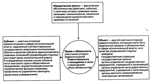 Административно-правовое отношение, как и все другие правоотношения, имеет структуру (см. схемы 4 и 5), а именно системную совокупность взаимосвязанных обязательных элементов: участники (стороны) правоотношения — субъект и объект управления; их субъективные права и юридические обязанности; поощрения и ответственность участников; юридический факт (факты).