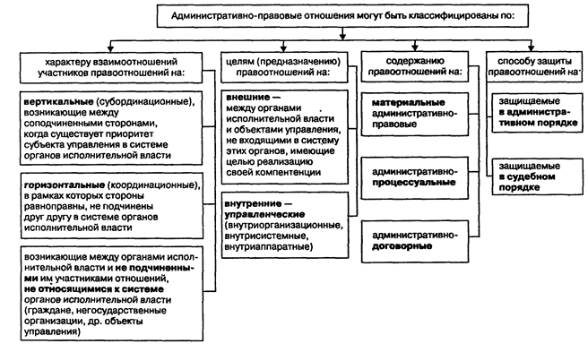 Административно-правовые отношения могут быть классифицированы по ряду критериев (см. схему 6): по характеру (особенностям) взаимоотношений их участников, по конкретным целям (предназначению) правоотношений; их содержанию; способу защиты правоотношений.