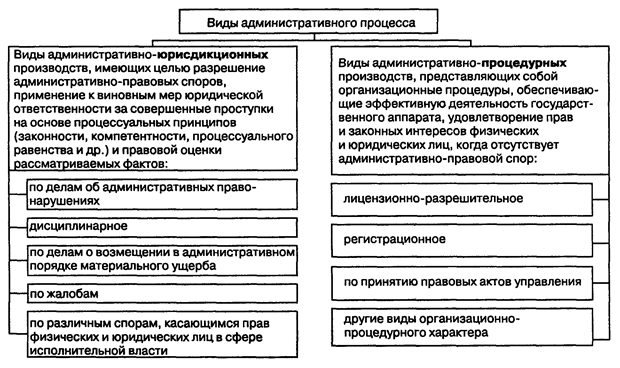 Понятие «административный процесс» трактуется расширительно: оно охватывает две обобщающие видовые группы административно-процессуальных производств — юрисдикционные и процедурные, отражающих процессуальную сторону деятельности соответствующих органов и должностных лиц по реализации задач и функций исполнительной власти. Каждый вид производства представляет собой установленный законом порядок разрешения индивидуально определенных административных дел или вопросов в целях обеспечения законности и государственной дисциплины. Однако между юрисдикционными и процедурными производствами имеются отличия по предмету и последствиям производства (см. схему 15).