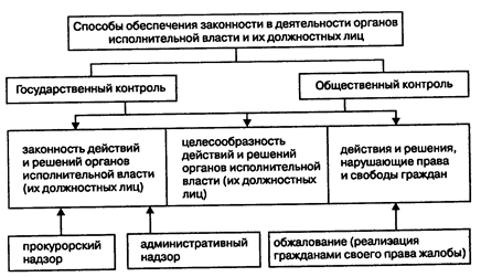 Вместе с тем действует особая система государственных органов, на которую возложена обязанность по поддержанию и укреплению законности и дисциплины в деятельности органов исполнительной власти. Применяемые ими различные правовые и организационные формы и методы деятельности, практические приемы, операции обобщенно называются способами обеспечения законности (см. схему 17.) Это — контроль и надзор, а также обжалование (реализация права жалобы).